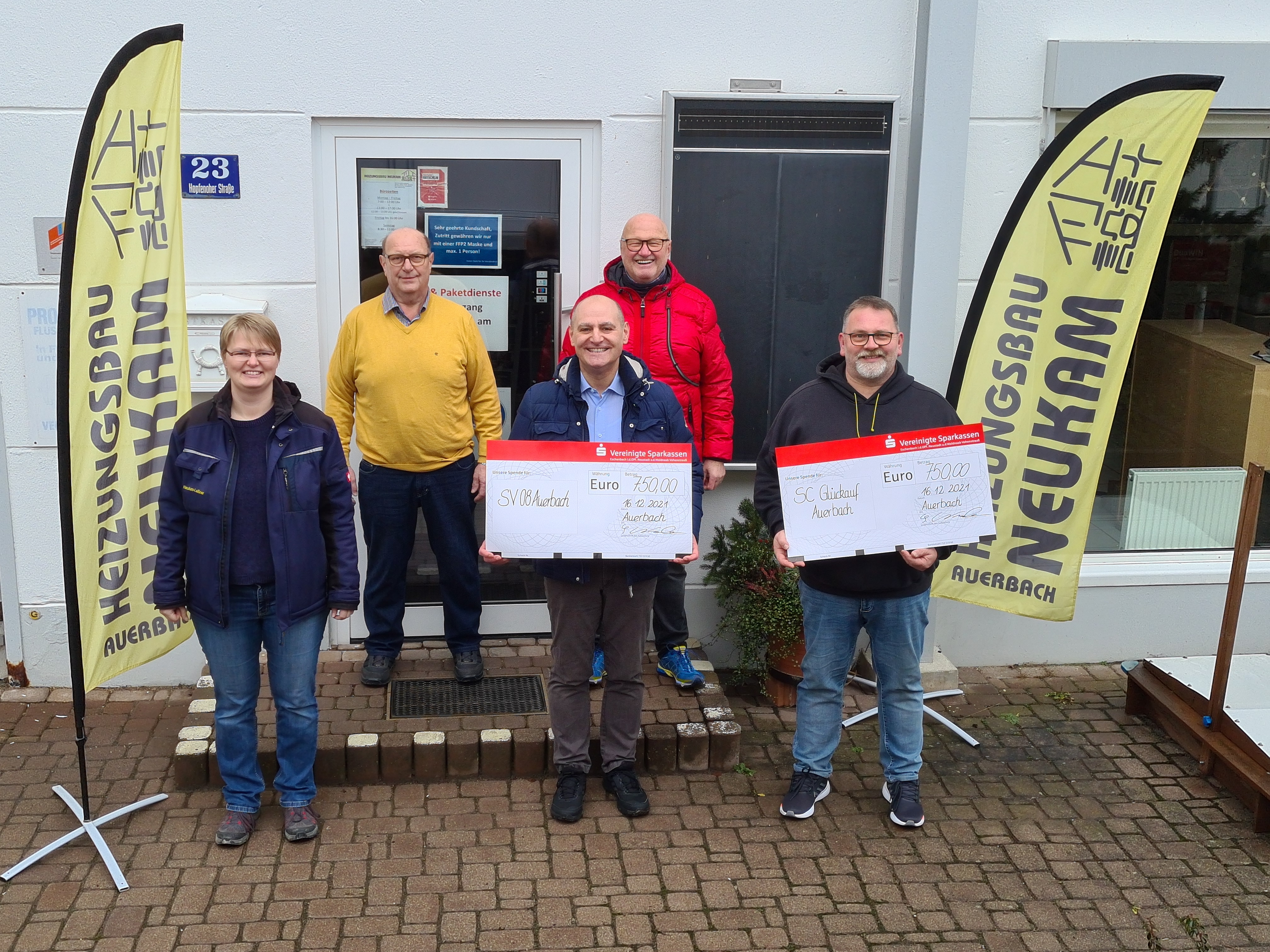 Birgit Neukam-Leißner und Siegfried Neukam unterstützen in diesem Jahr die Sportvereine des SV 08 Auerbach und des SC Glückauf Auerbach. Sie überreichten je einen Scheck über 750,00 EUR an die Vertreter beider Vereine. Der SC Glückauf Auerbach verwendet die Zuwendung für den Ausbau der SG Auerbach/Troschenreuth und die Jugendarbeit. Der SV 08 Auerbach wird die Spende für den Jugendfußball verwenden.